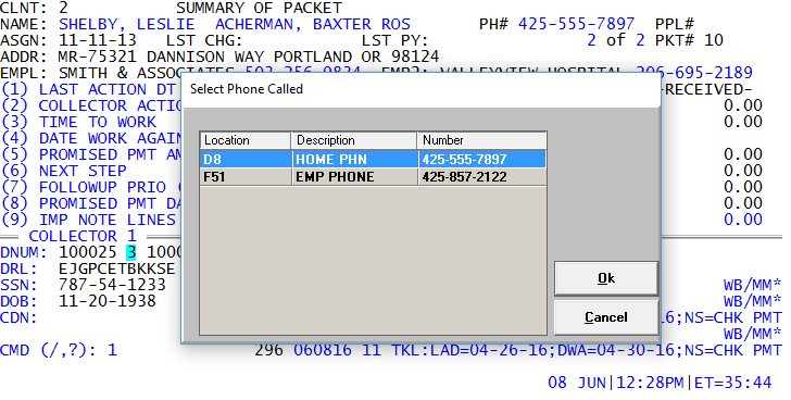 The collector then calls the customer's employer phone, where the collector talks to the customer. In the Collector Action (?) field, the collector enters the contact action code 216 Tel POE/Talked to Debtor to record the result of the call. The collector then selects the customer's employer phone number to apply the action code to. Or as a shortcut, the collector can simply type the action code, a forward slash (/), and the Fiscal field number where the contact value resides (for example, 206/F36). By entering the result this way, the Select Phone Called window does not display, and you can move on to the next step in working the account.