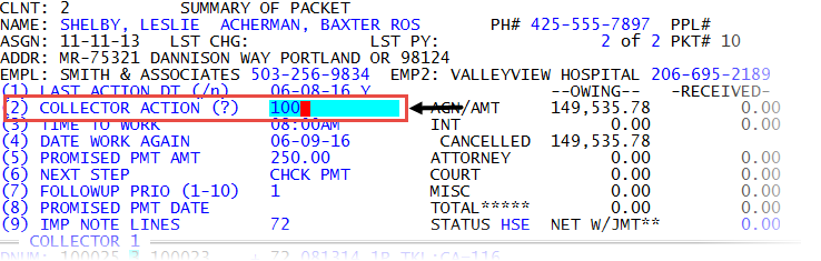 For example, a collector at a fictitious agency, Lake Assets, attempts to contact an account by calling the customer's home phone. The collector does not receive an answer, so in the Collector Action (?) field, the collector enters the contact action code of 100 Tel Res/No Answer to record the result.