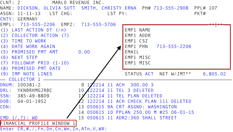 Use commands WF, WFn, or WF? to access the fields of the Financial Profile screen from a window in the Collector screen. This allows you to view and edit financial and other information about the account without opening the Financial Profile screen.