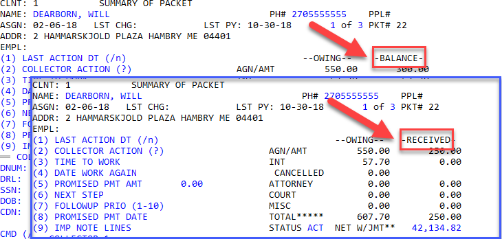 The right-hand column of the financial information portion of the Collector screen toggles between Received and Balance each time you type L, and press Enter at the CMD prompt. To toggle back and forth, repeat this step.
