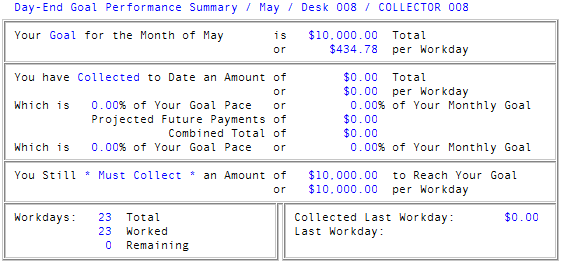 Use command CG to view the Day-End Goal Performance Summary screen, which compares the amounts you have collected to date against the goals for the month. This screen provides the following information: