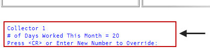 Another blank goal screen appears with the collector number and the number of days already worked this month at the bottom of the screen.