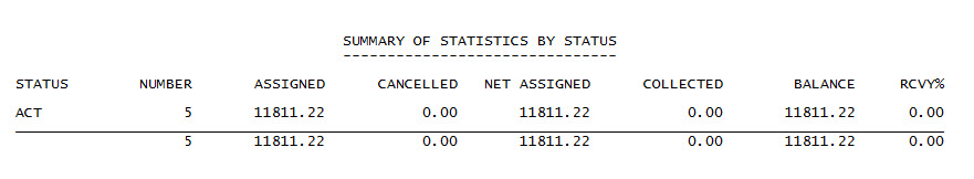 The Summary of Statistics by Status report prints the number of assignments, amounts assigned, amounts collected, and so on, for each status code. The status codes included in the report are determined in the Client Inventory Setup. For more information, see Configuring the Client Inventory Report.