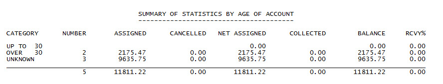 The Summary of Statistics by Age of Account report uses the same information and status code exclusions as the Summary of Statistics by Status report. The age of the account is based on the assignment date minus the latest date a charge or payment was made to the client's record. If an assignment date or client's last charge/last pay date is missing, the category Unknown is used. Aging categories are set up for each client in field 153-Perf/Sts/Age/Bal of the Client Control Record. For more information, see Creating or changing the Client Control Record.