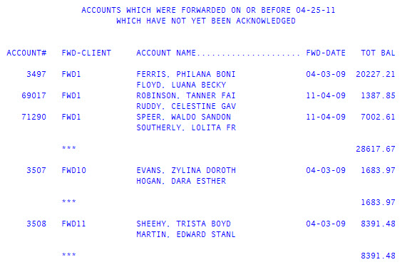 Use this report to view the account name and number, the forward client number, and the forward date and balance for each account not acknowledged.