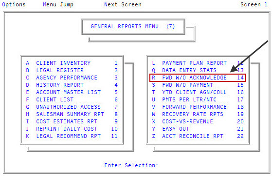 From the Master menu, navigate to General Reports > Fwd W/O Acknowledge (menu 7.14).