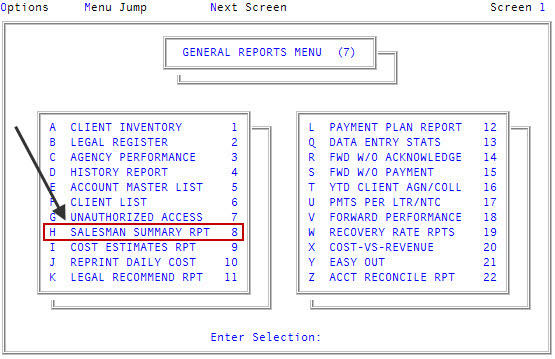From the Master menu, navigate to General Reports > Salesman Summary Rpt (menu 7.8).
