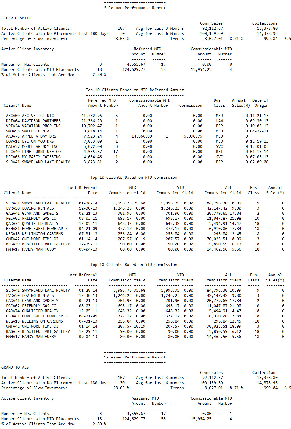 - For each salesperson, a list of the top 10 clients based on MTD referred amount, MTD commission, and year-to-date (YTD) commission.