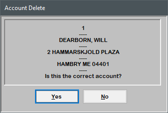 In the Account Delete window, review the account number, name, and address. To delete the account, click Yes; otherwise, click No.