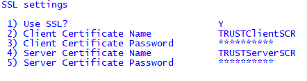 - To use SSL communication, type Y. SSL requires the Client and Server Certificate Name and Password fields be populated with settings from the Windows service. Press Enter to navigate through these fields. When done, click Ok.