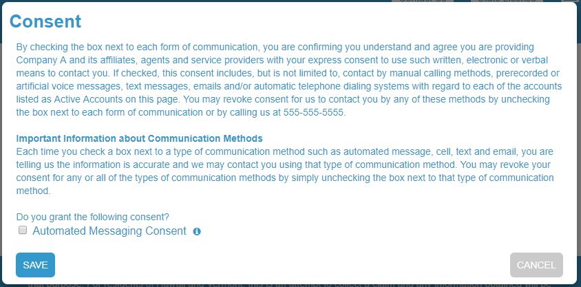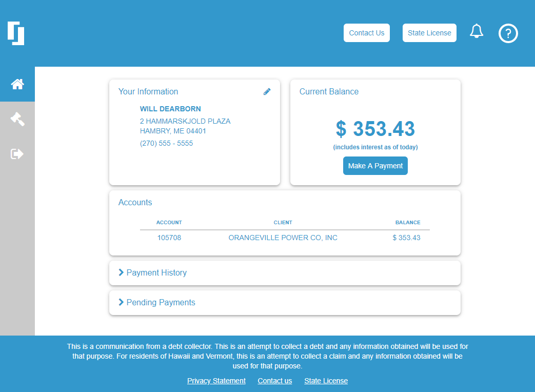 The Consumer Portal displays the account and debtor information. At this point the consumer can update contact information, make a payment, view their payment history, etc.