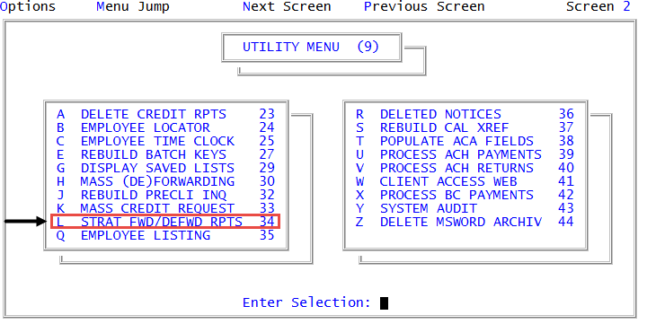 The Strat Fwd report option is located on Screen 2. To access the second screen, press Enter at the Enter Selection prompt.